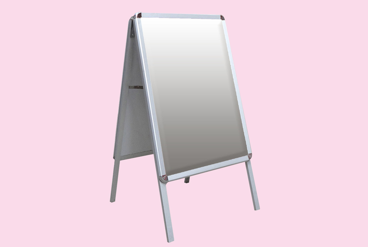 Επιδαπέδιο σταντ εσωτερικού-εξωτερικού χώρου διαστ. Α2 / Α1 / Β2 / Β1, 2 όψεων, από αλουμίνιο με κλιπ-κλαπ για εύκολη τοποθέτηση εκτυπωμένου θέματος και πλαστική διαφάνεια για αδιαβροχοποίηση.